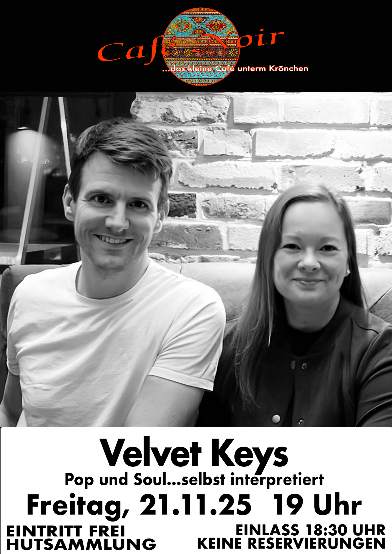 Mit ausdrucksstarker Stimme und feinsten Pianoklängen interpretiert „Velvet Keys" Pop- und Soulstücke auf ihre eigene, gefühlvolle Weise. Das Duo schafft eine warme, stilvolle Atmosphäre und lädt zum entspannten Zuhören ein.